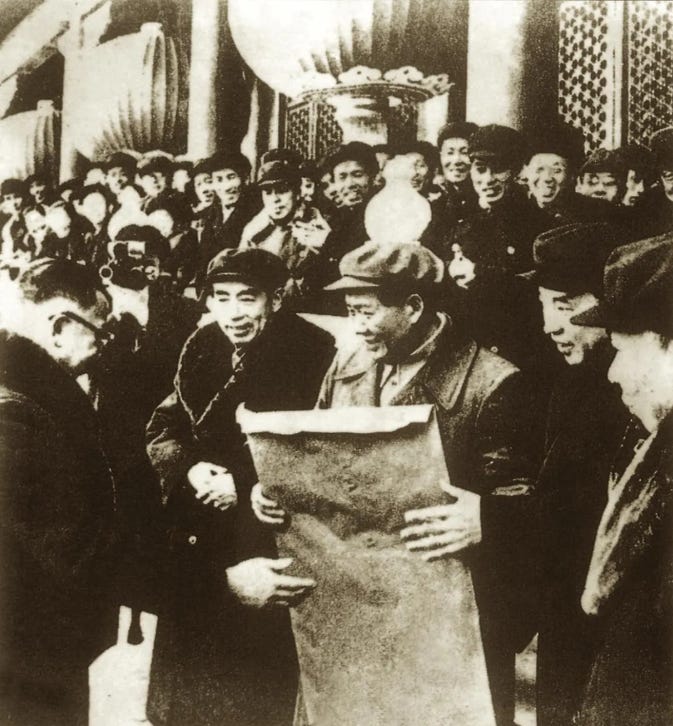 1946年5月4日,中共中央发布了刘少奇起草的《五四指示》,明确提出“从地主手中获得土地,实现耕者有其田”的方针,标志着土改运动的正式开始。这一政策改变了抗战时期温和的减租减息措施,表明中共决心彻底改变土地占有模式,消灭地主阶层,进一步推进土地私有化的改革。1947年7月至9月,中共中央工作委员会召开全国土地会议,并通过《中国土地法大纲》,10月10日正式发布,标志着中共农村土地政策的根本转变。从此,中共的土地政策始终以自耕农土地私有为基础,直到三大改造后土地实现公有化。因此,无论是土地改革还是农业合作化,都以保障农民土地占有为前提。